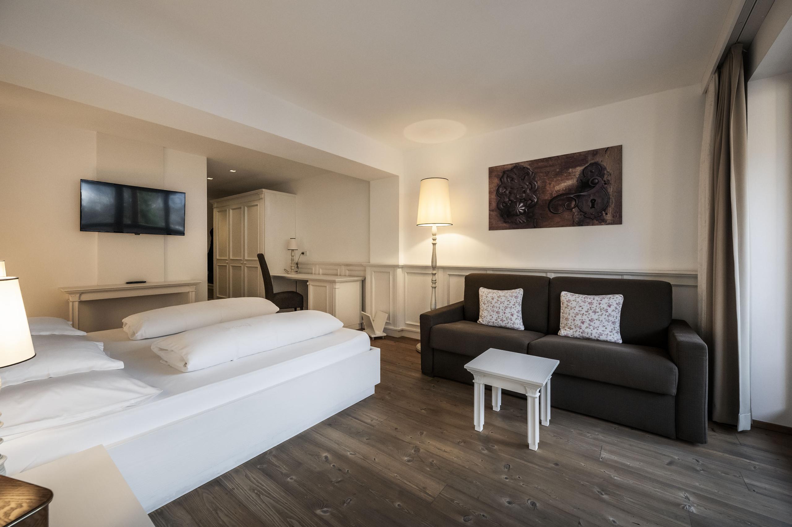 Double bed with high-quality Dorelan mattresses / Sofa bed / Bathroom with shower, toilet, and bidet / TV / Desk / Minibar / Safe / Telephone / Beauty mirror / Hairdryer / South-facing balcony (5m²) with seating / View of the Mt Casella