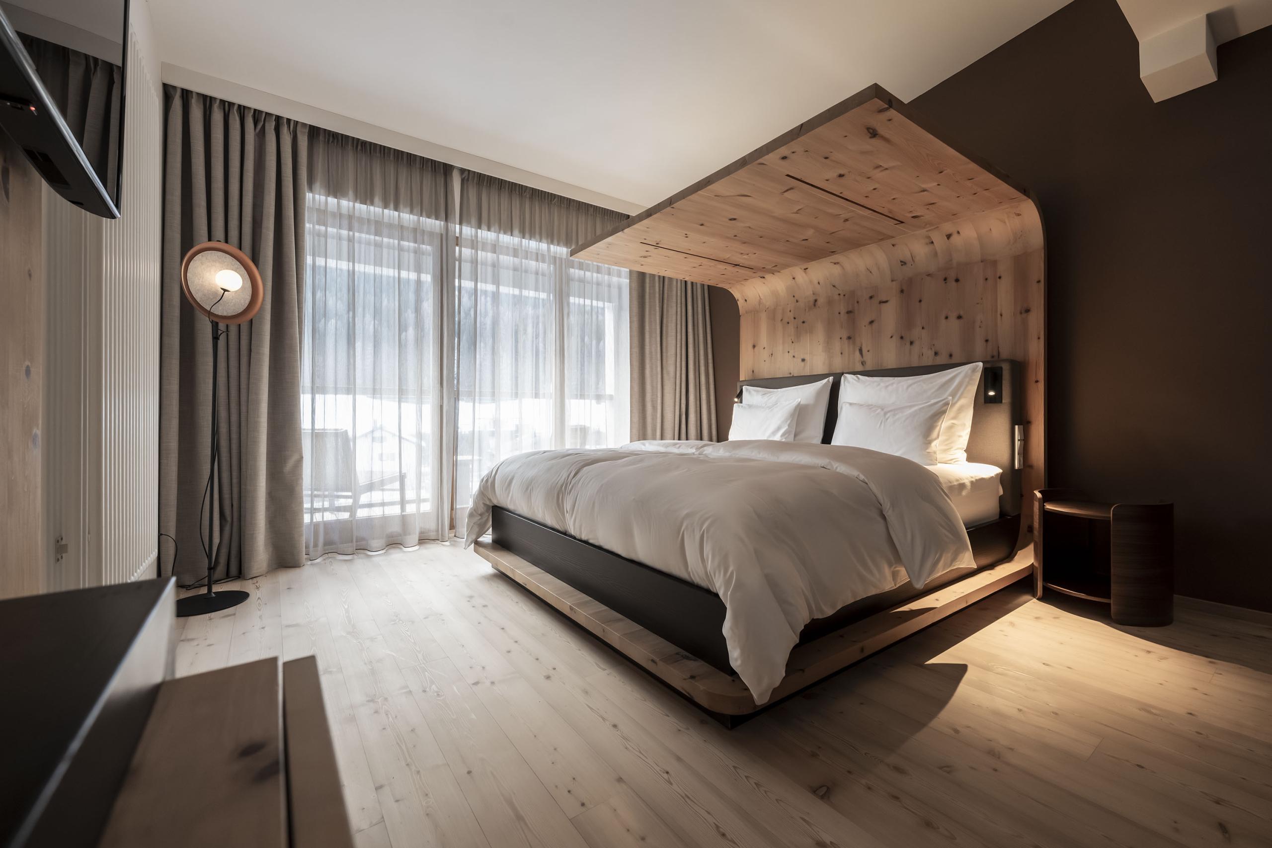 Double bed made of Swiss stone pine with high-quality Dorelan mattresses / Sofa bed (190 × 95 cm) / Bathroom with Raindance shower, toilet, and bidet / TV / Desk / Minibar / Safe / Telephone / Beauty mirror / Hairdryer / South-facing balcony (5m²) with seating