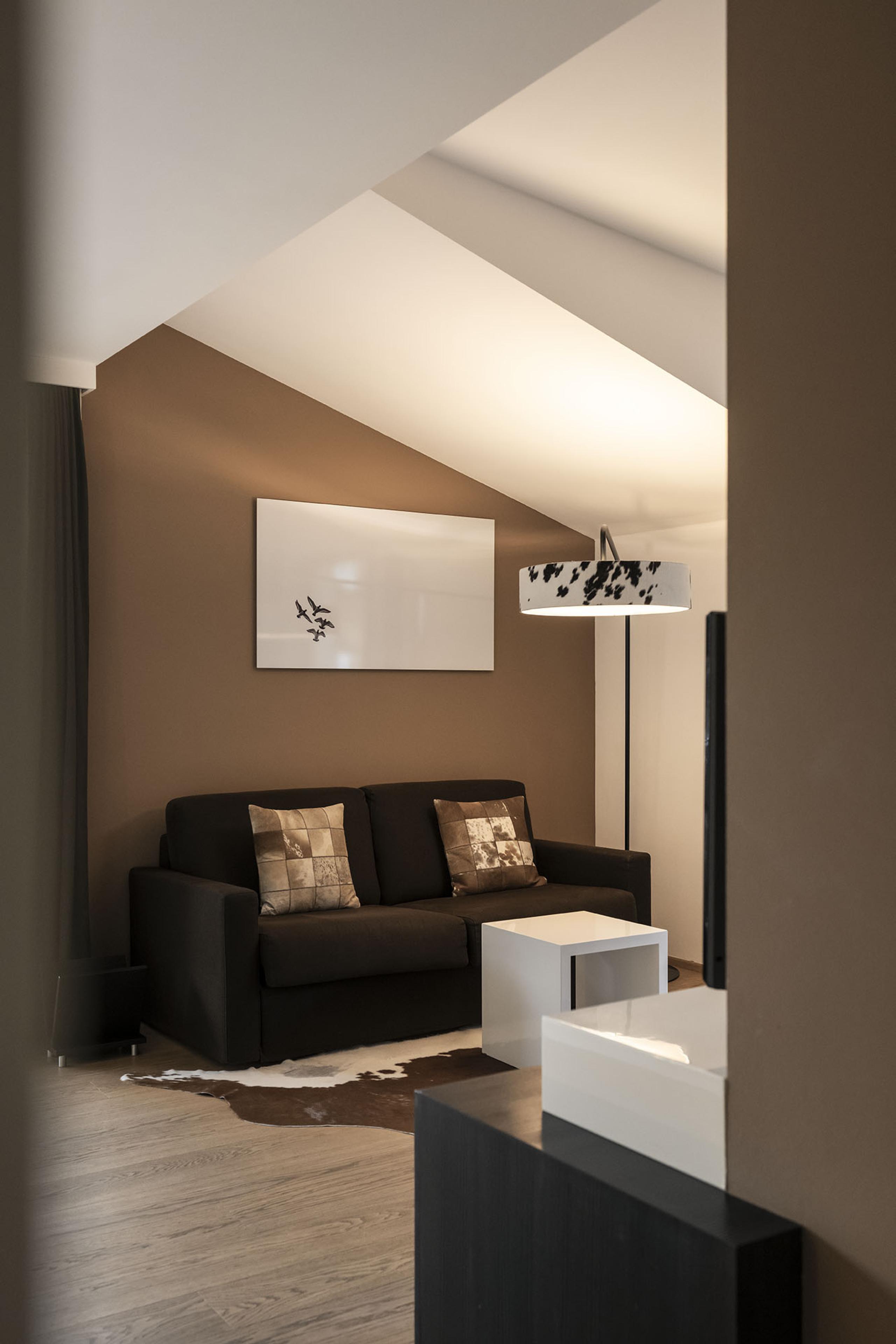 The Edel & Weiss superior double room combines on 38 m² modern living with Alpine flair. White high-gloss furniture sets elegant accents, while dark fabrics and colours create a harmonious balance. The oak flooring gives the room warmth and naturalness. A special highlight is the cowhide-look headboard.