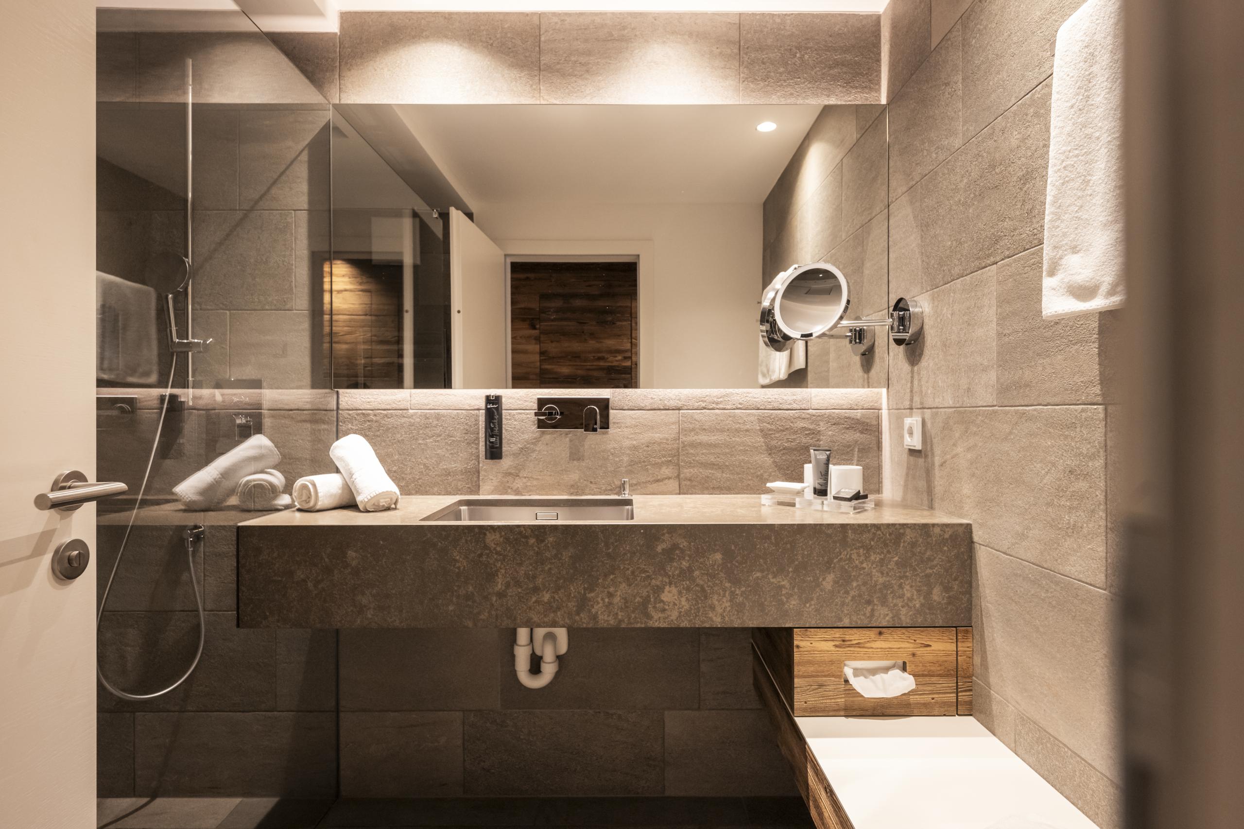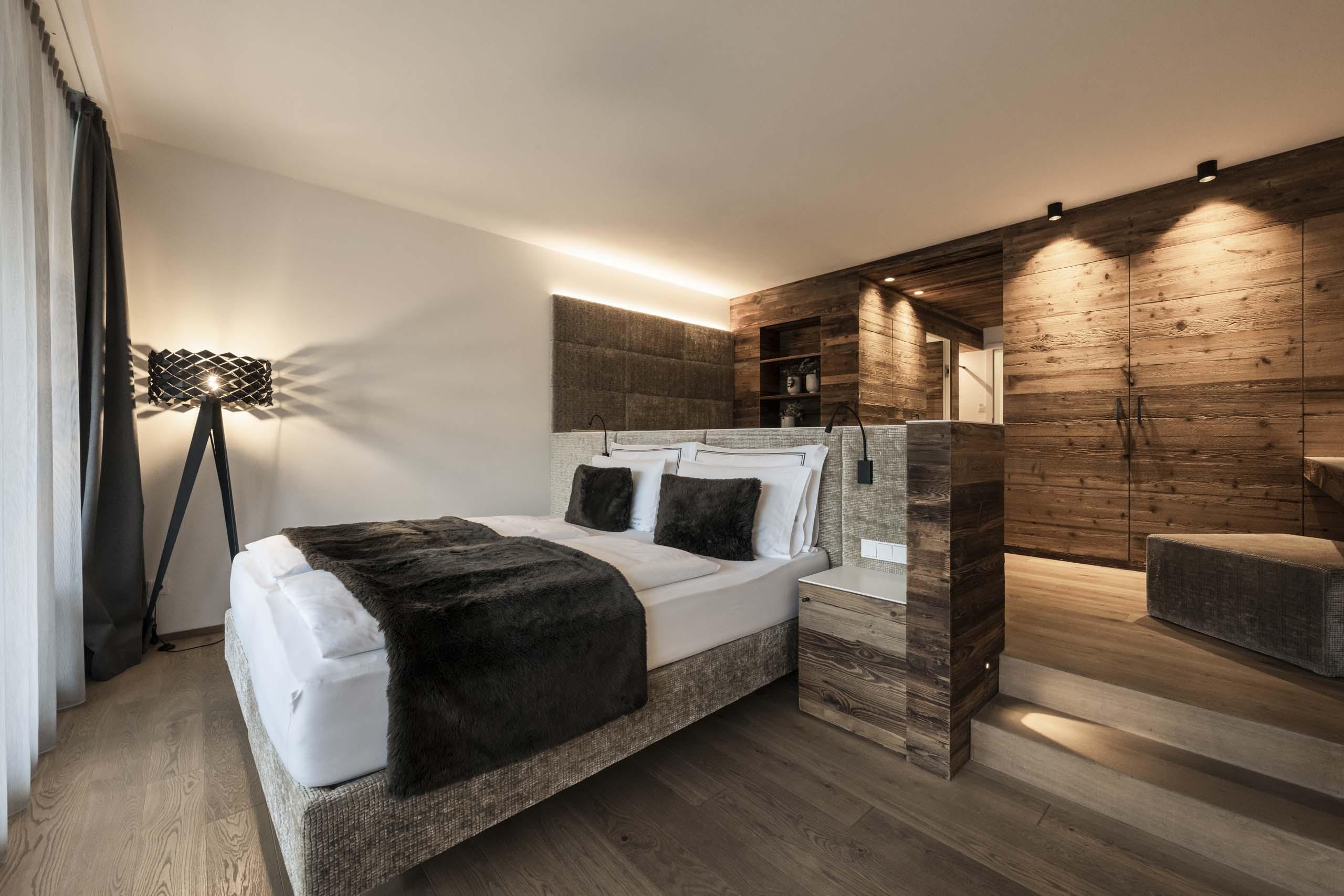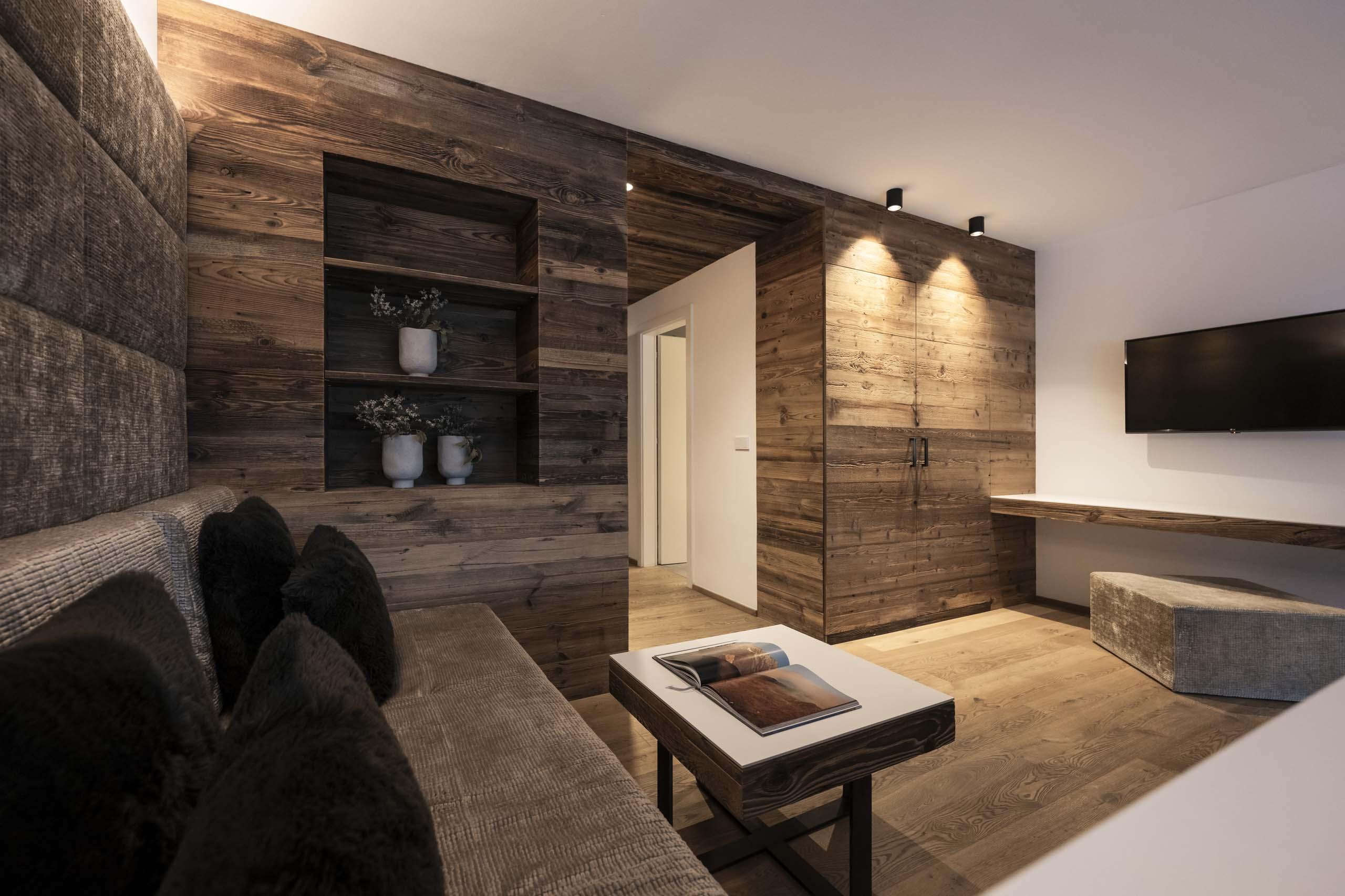 Eleganza con un pizzico di fascino rustico. Nell’atmosfera accogliente della suite berg.tal al piano terra, troverete lo spazio ideale per rilassarvi. La simbiosi tra il legno naturale, il design lineare e i colori vivaci conferisce all’ambiente fascino e lusso. L’highlight visivo: il soggiorno, il bagno e il WC si trovano su un unico livello, mentre la zona notte di due gradini più in basso.